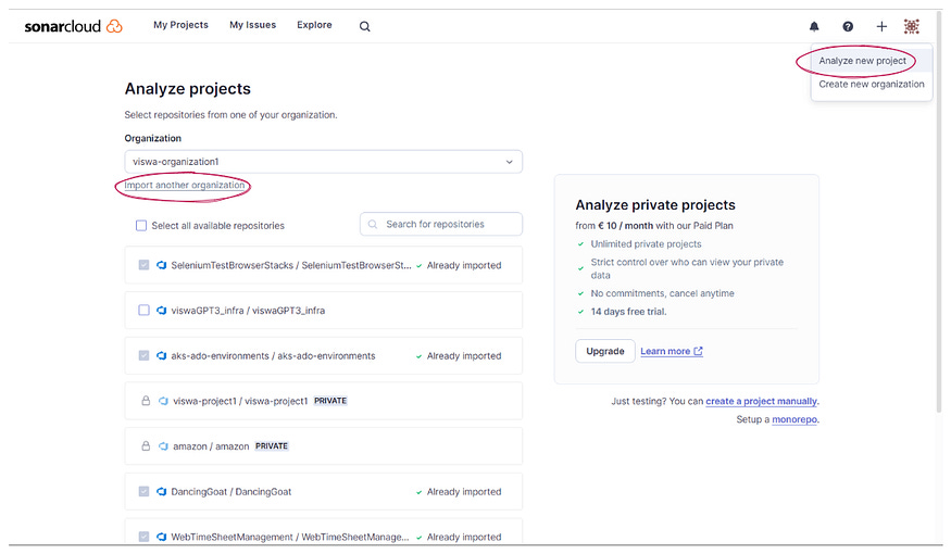 Later, you can create additional SonarCloud organizations by clicking + > Create New Organization (under the plus sign in the top bar) and specifying an organization on the repository platform side to import.
