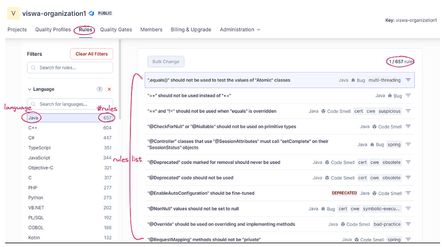 Type: bug, vulnerability, code smell, or security hotspot rules.