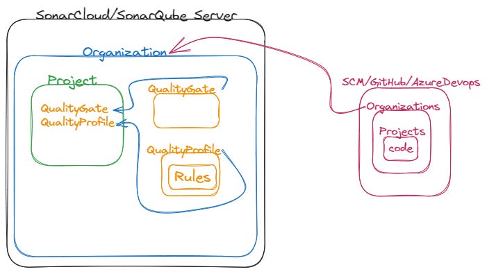 Each SonarCloud organization represents a corresponding organization on the repository platform side. The two organizations are bound one-to-one.